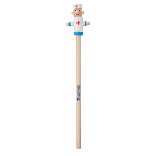 A pencil with a doctor's figure and faculty logo.